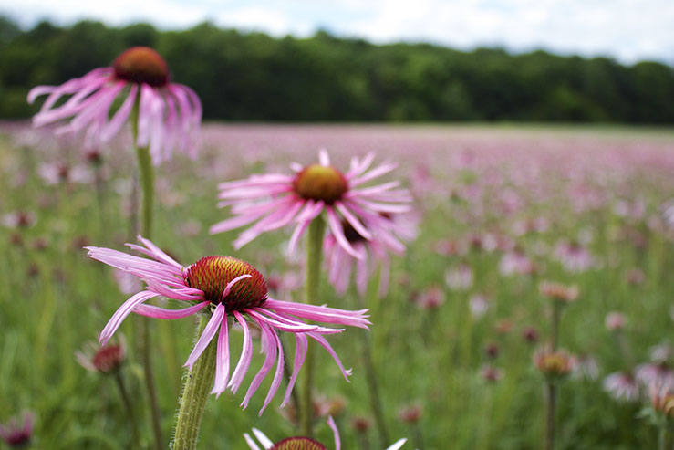 Auf unseren Feldern wachsen unter anderem Sonnenhut, Pfefferminze, Spitzwegerich, Artischocken, Baldrian, Angelika, grüner Hafer, Melisse, Kapuzinerkresse, Goldrute, Dill, Petersilie, und Liebstöckel.